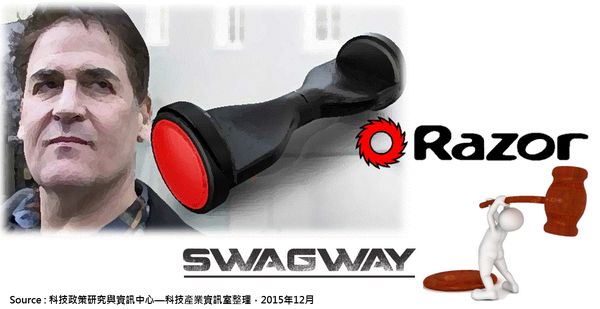 图一、两轮式电动体感平衡车专利诉讼,Razor USA及Shane Chen控告Swagway